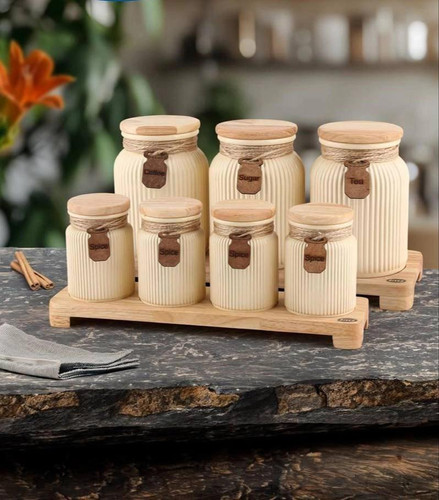 ست جاادویه سرامیکی 6 عددی با درب بامبو و استند چوبی بامبو
