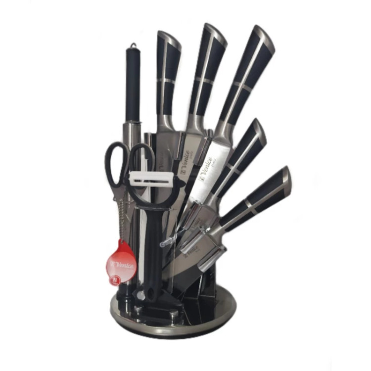 پایه گردان،چاقو در چهار سایز مختلف،یک عدد ساطور،یک عدد قیچی،یک عدد پوست کن،یک عدد چاقو تیز کن می باشد.