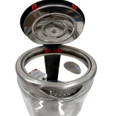 ظرفیت کتری در این چای ساز 1.7 لیتر و ظرفیت قوری 1.0 لیتر میباشد. کتری و قوری از جنس شیشه پیرکس مقاوم هستند و مقاومت بالایی در برابر دما و حرارت دارند و تا 170 درجه سانتیگراد را پوشش میدهند. بر روی کتری، درپوشی پلاستیکی قرار دارد، که از جنس استیل است و با کمک کلید پدالی باز و بسته خواهد شد. در کنار کتری یک دسته آرگونومیک طراحی گردیده، این دسته نیز از جنس پلاستیک نسوز هستش و در مقابل حرارت و دمای بالا مقاومت زیادی دارد. از آنجایی که کتری به سیم برق وصل نیست، بنابراین آزادی عمل بیشتری دارد و میتوان به راحتی آن را حرکت داد. و کتری را برداشت و از آن استفاده نمود. همچنین از قابلیت چرخش 360 درجه، یعنی قرار گرفتـن کتری در جهات مختلف نیز بهره میبرد.