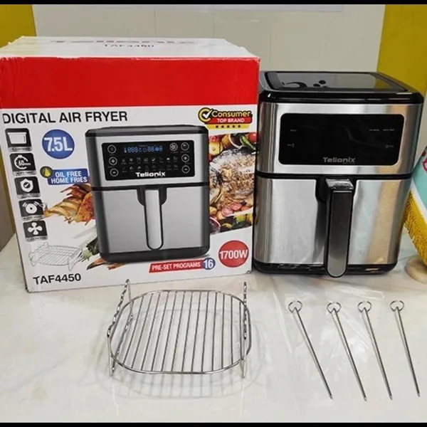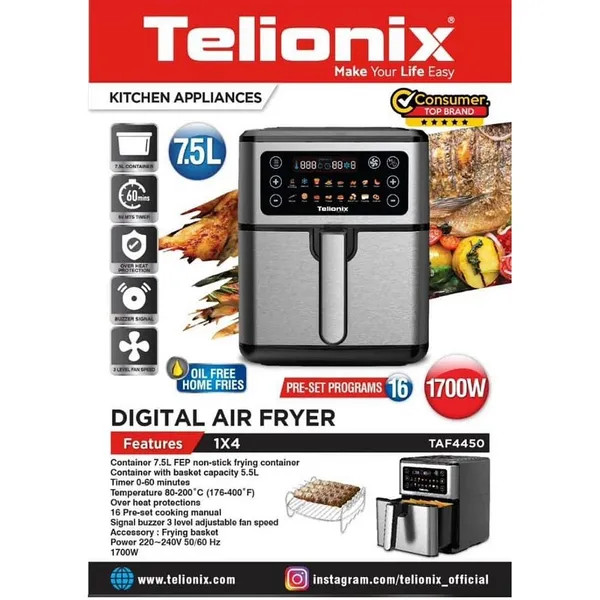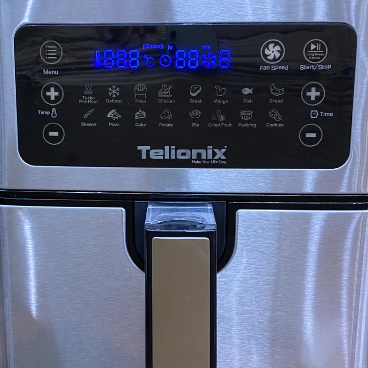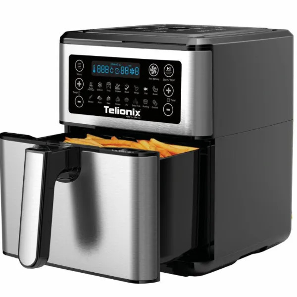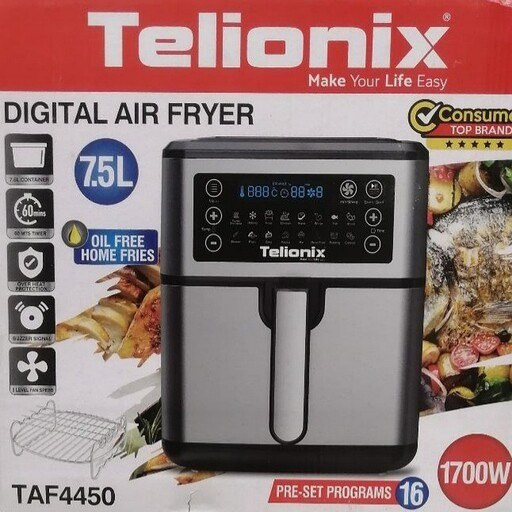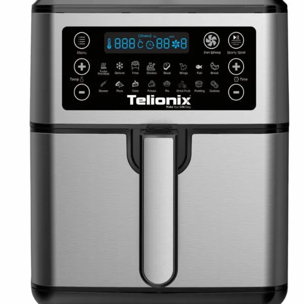 سرخ کن بدون روغن تلیونیکس مونتاژ و ساخت امارات متحده تحت لیسانس فرانسه این محصول از تلیونیکس یکی از بهترین محصولات این برند بوده و این محصول دارای 16 برنامه پخت غذایی می باشد که شامل برنامه پخت غذایی بسیار کامل از جمله یخ زدایی خشک کردن میوه و سبزیجات و... بوده پوین مثبتی که این سرخ کن داره که از مابقی برند ها متمایز میکنه اینه که 3 سرعت فن داره که اولین سرخ کن موجود در بازار می باشد که همچین آپشن منحصر به فرد و فوق العاده رو داشته باشه .. این محصول 7.5لیتر گنجایش داره که فضای بسیار مناسبی رو برای مصرف کننده فراهم کرده .سبد این دستگاه از نسل جدید سبد ها می باشد که ضد خش می باشد این محصول دارای سبد دوبل یا بسکت جدا شونده می باشد