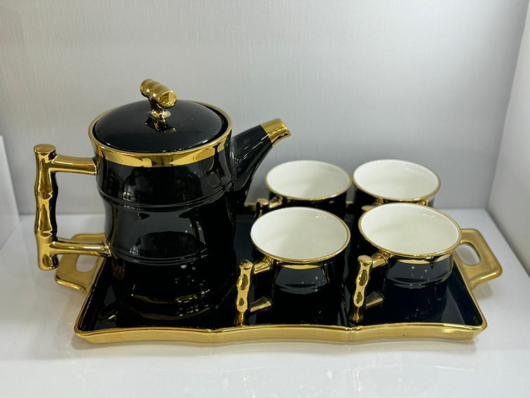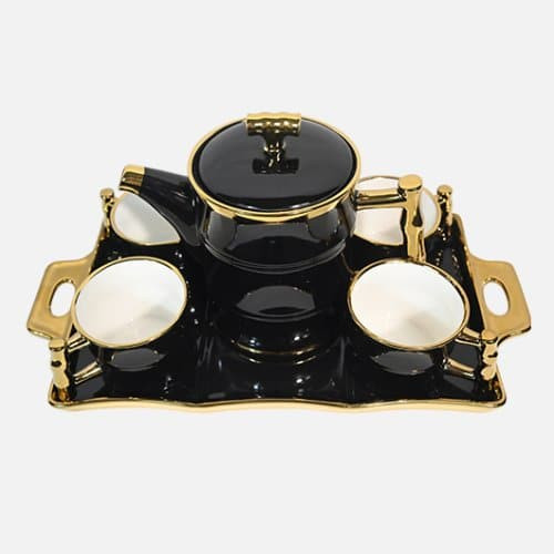 ست چای خوری سیاه و طلایی با سینی (ست 6 تکه)