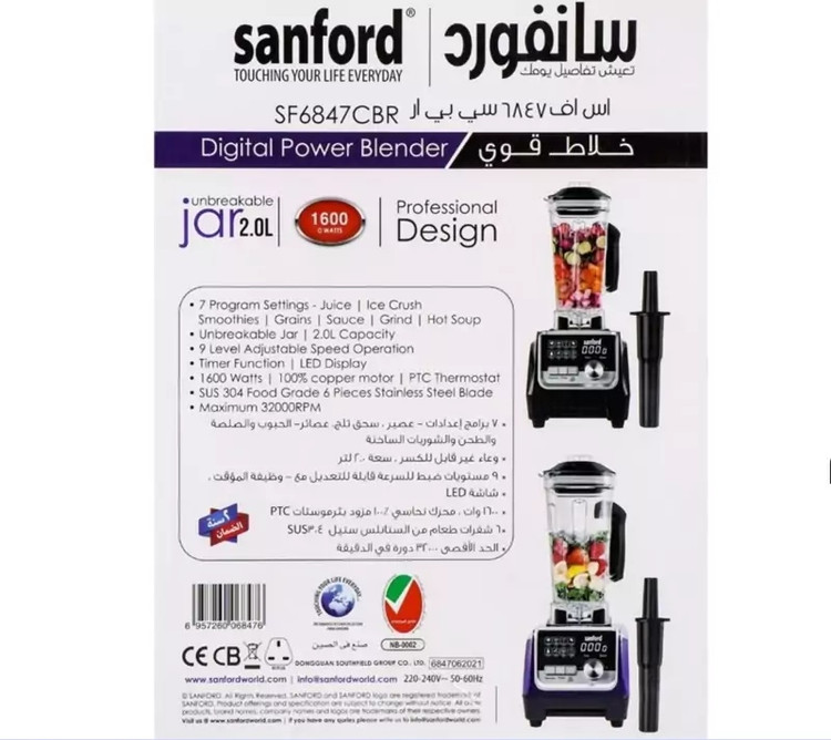 7 تنظیم برنامه شامل آبمیوه، یخ خرد کردن، اسموتی، غلات، سس، آسیاب، سوپ داغ است. این شیشه نشکن با ظرفیت 2 لیتر است. همچنین دارای عملکرد تایمر، نمایشگر LED، عملکرد سرعت قابل تنظیم 9 سطح، 1600 وات، موتور 100% مسی و تیغه استیل 6 تکه مواد غذایی SUS 304.