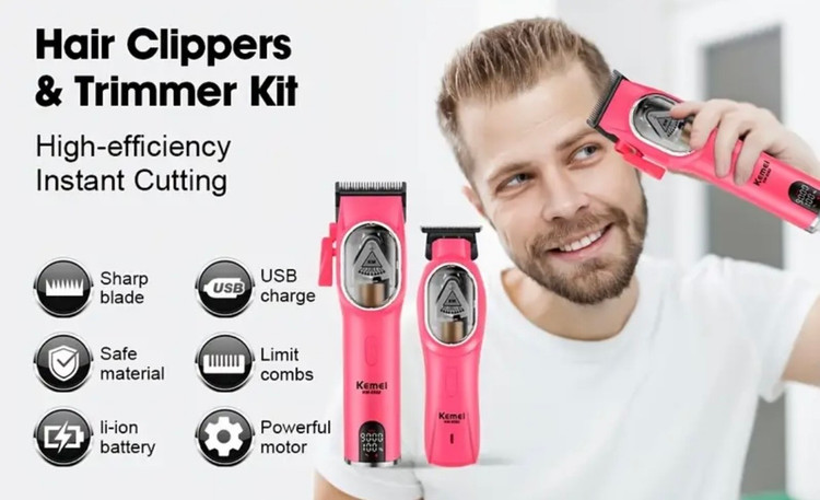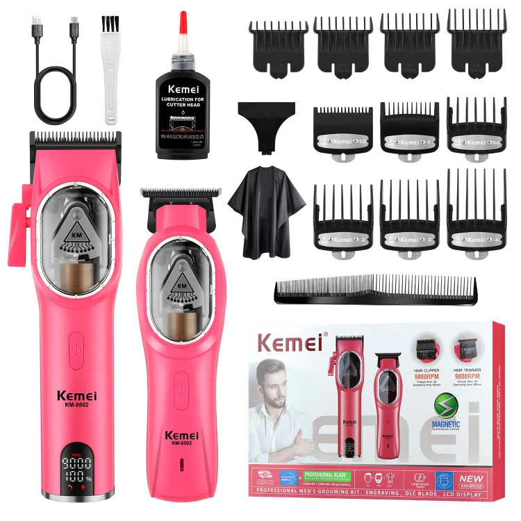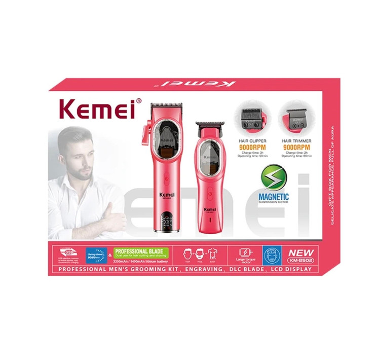 ست حرفهای KM-8502 شامل یک ماشین اصلاح حجمزن و یک خطزن دقیق است که هر دو مجهز به تیغههای متالورژی پودری با روکش DLC و موتور مگنتی قدرتمند هستند. این ست برای اصلاح حرفهای، فید، سایهکاری، خطگیری و طراحی مناسب است و با باتریهای قوی و لوازم جانبی کامل عرضه میشود.