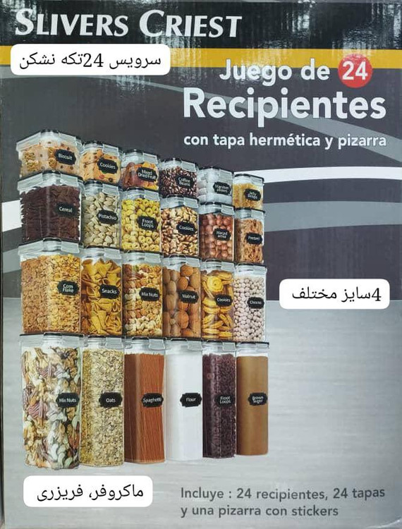 توضیحات: سرویس کامل حبوبات 24تکه نشکن فریزری ماکروفری قفل دار واشر دار در 4 سایز هرکدام 6عددی بسیار مقرون ب صرفه کیفیت جنس فوق العاده عالی وارداتی مخصوص انواع مواد خوراکی حبوبات وخشکبار