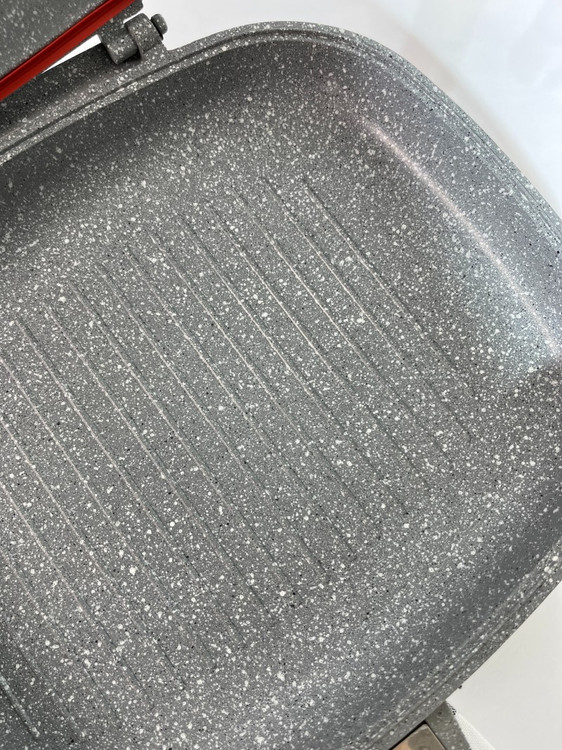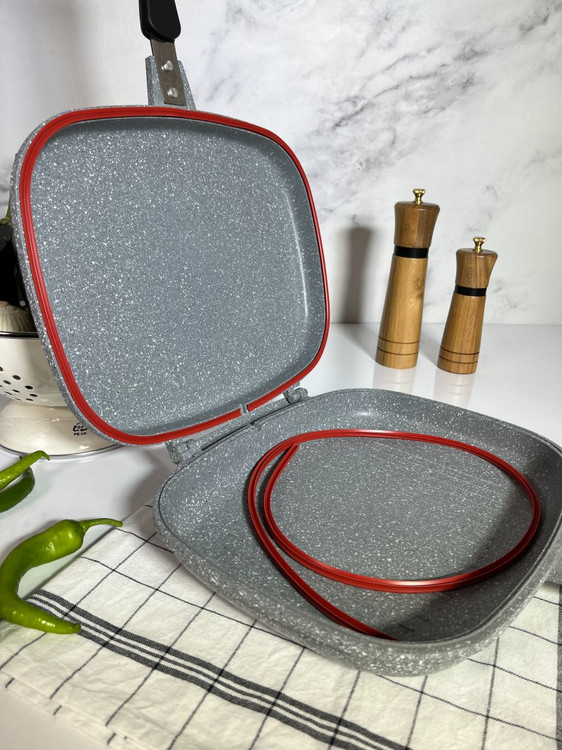 - طراحی دوطرفه و درب آهنربایی: پخت یکنواخت و حفظ حرارت در دو طرف غذا بدون نیاز به برگرداندن با کفگیر
