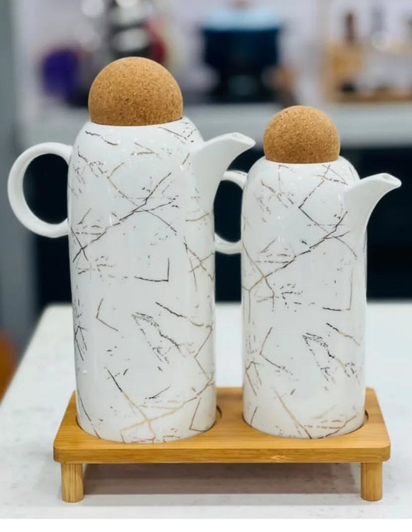 جاآبلیمو و جاروغنی سرامیکی طرح ماربل با درب توپی و استند بامبو، انتخابی شیک و کاربردی برای نگهداری انواع روغن، سرکه، آبلیمو و سسهای مورد علاقه شماست. این ست جذاب با طراحی مدرن و مینیمال، جلوهای خاص به میز غذاخوری یا آشپزخانه شما میبخشد.