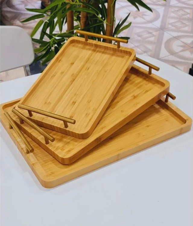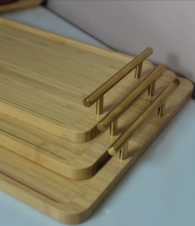 اگر بهدنبال یک ست سینی شیک و مقاوم برای پذیرایی یا دکور منزل هستید، سینی سه تکه بامبو با دسته طلایی از فروشگاه نگین جنوب بهترین انتخاب است. این محصول شامل سه عدد سینی با سایزهای مختلف بوده و از چوب بامبو طبیعی و مقاوم ساخته شده است. دستههای فلزی با آبکاری طلایی، جلوهای لوکس و زیبا به این سینیها داده و آنها را برای پذیرایی از مهمان یا حتی استفاده به عنوان سینی دکوری مناسب میکند.