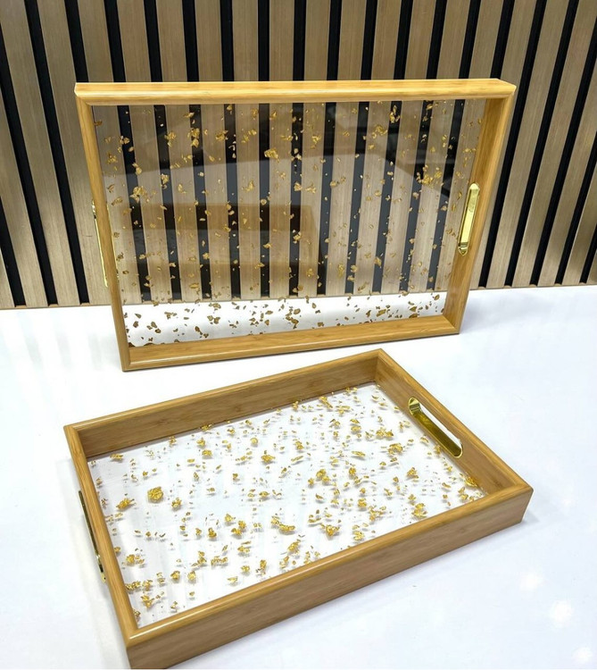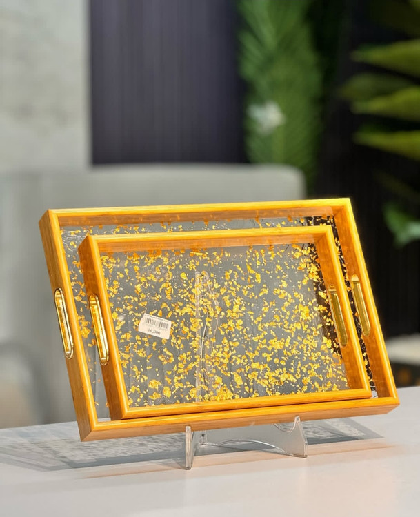 این محصول شامل دو عدد سینی در سایزهای متفاوت بوده که با کف آکرولیک شفاف و براق و تزئینات ورق طلایی اصل جلوهای بسیار خاص و مدرن دارد. طراحی خاص این سینیها باعث میشود هم برای استفاده روزمره و هم برای مجالس و مهمانیها انتخابی بینقص باشند.