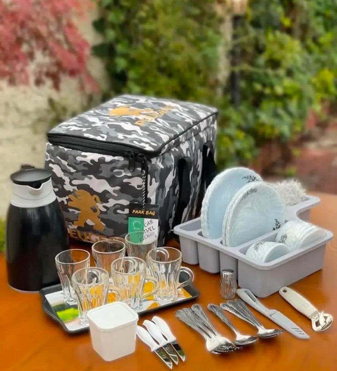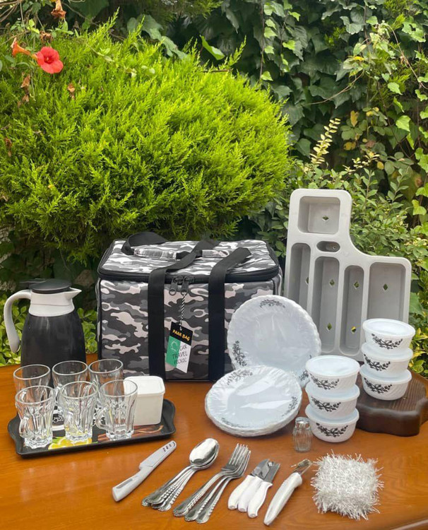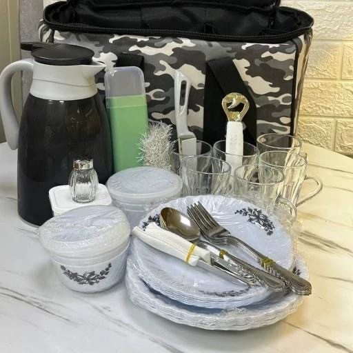 ست کیف مسافرتی برزنتی شش نفره پونا همراه با فلاسک و سرویس کامل غذاخوری و استکان