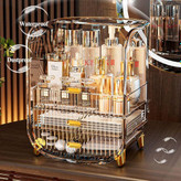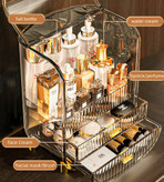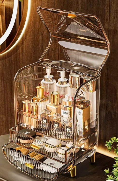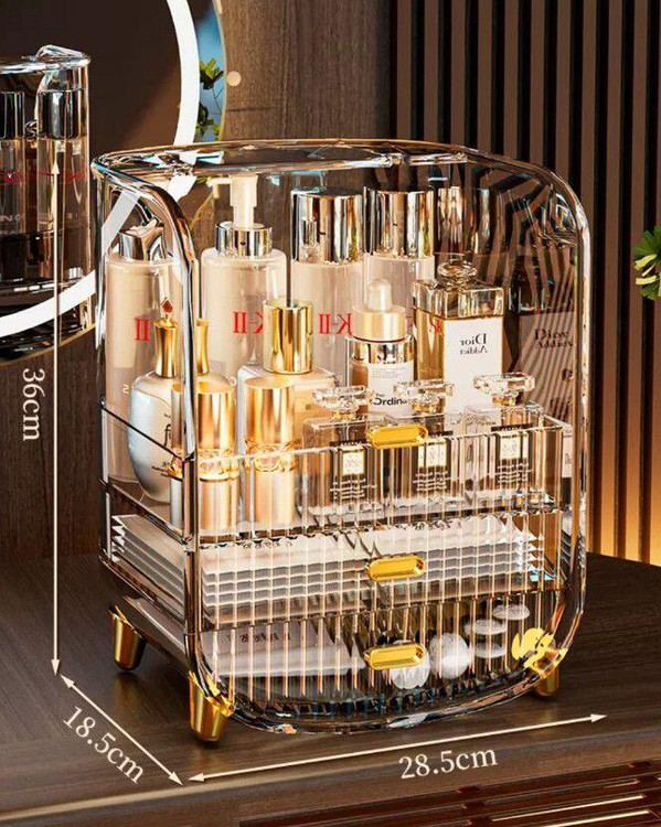 این استند لوازم آرایشی دارای طراحی دو طبقه و چند کشو است که فضای کافی برای نگهداری انواع لوازم از جمله رژ لب، مداد ابرو، براش، کرمپودر، لاک ناخن، عطر، گردنبند، انگشتر و… فراهم میکند.