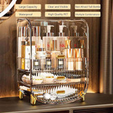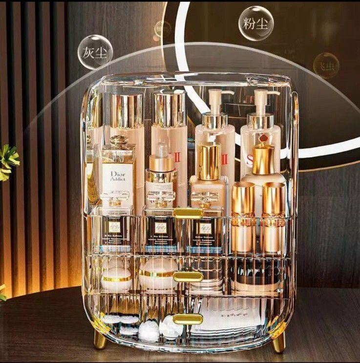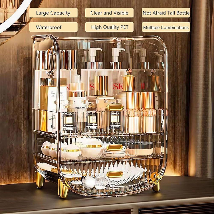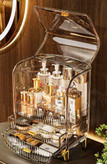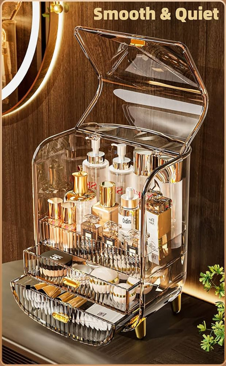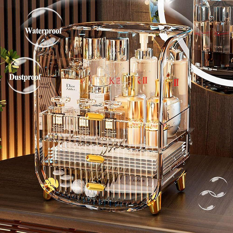 استند لوازم آرایشی آکریلیک رنگ شامپاینی | نگهدارنده لوازم آرایش و جواهرات با درب ضد گرد و غبار