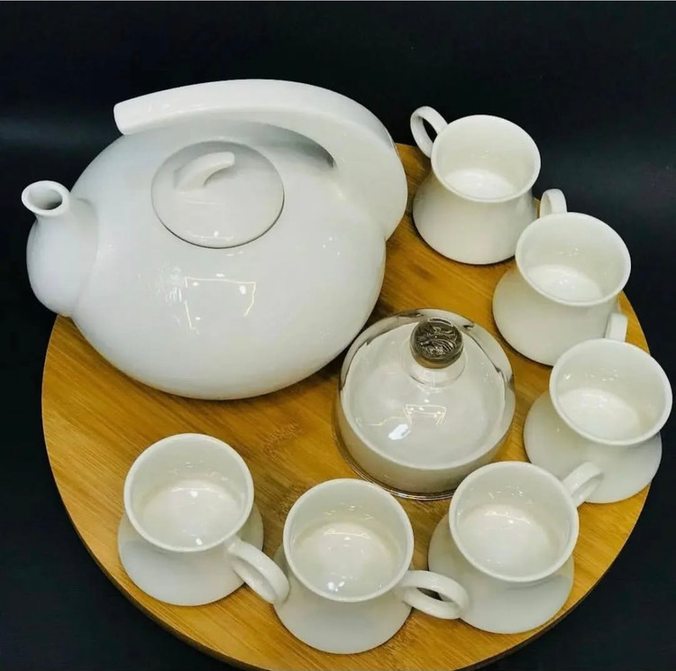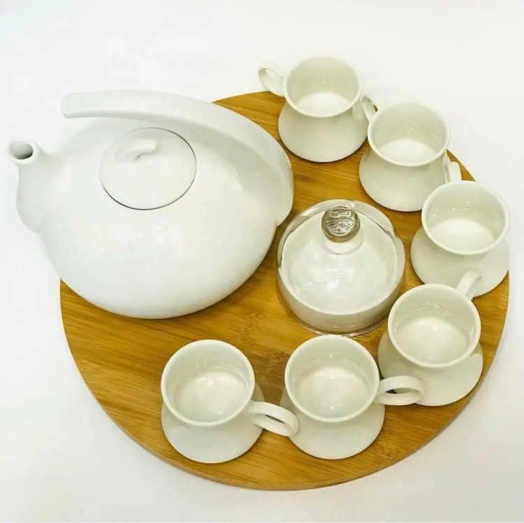 ست کامل چایخوری سرامیکی سفید با سینی گرد بامبو چرخان