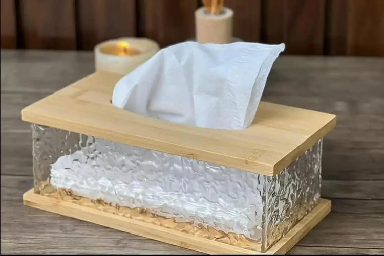 این جا دستمالی طراحی شده و برای انواع دستمال کاغذی استاندارد مناسب است. استفاده از جنس آکریلیک باکیفیت باعث شده مقاومت بالایی در برابر ضربه و خط و خش داشته باشد، در حالی که درب چوبی بامبو علاوه بر زیبایی، باعث سهولت در پر کردن و استفادهی مجدد میشود.
