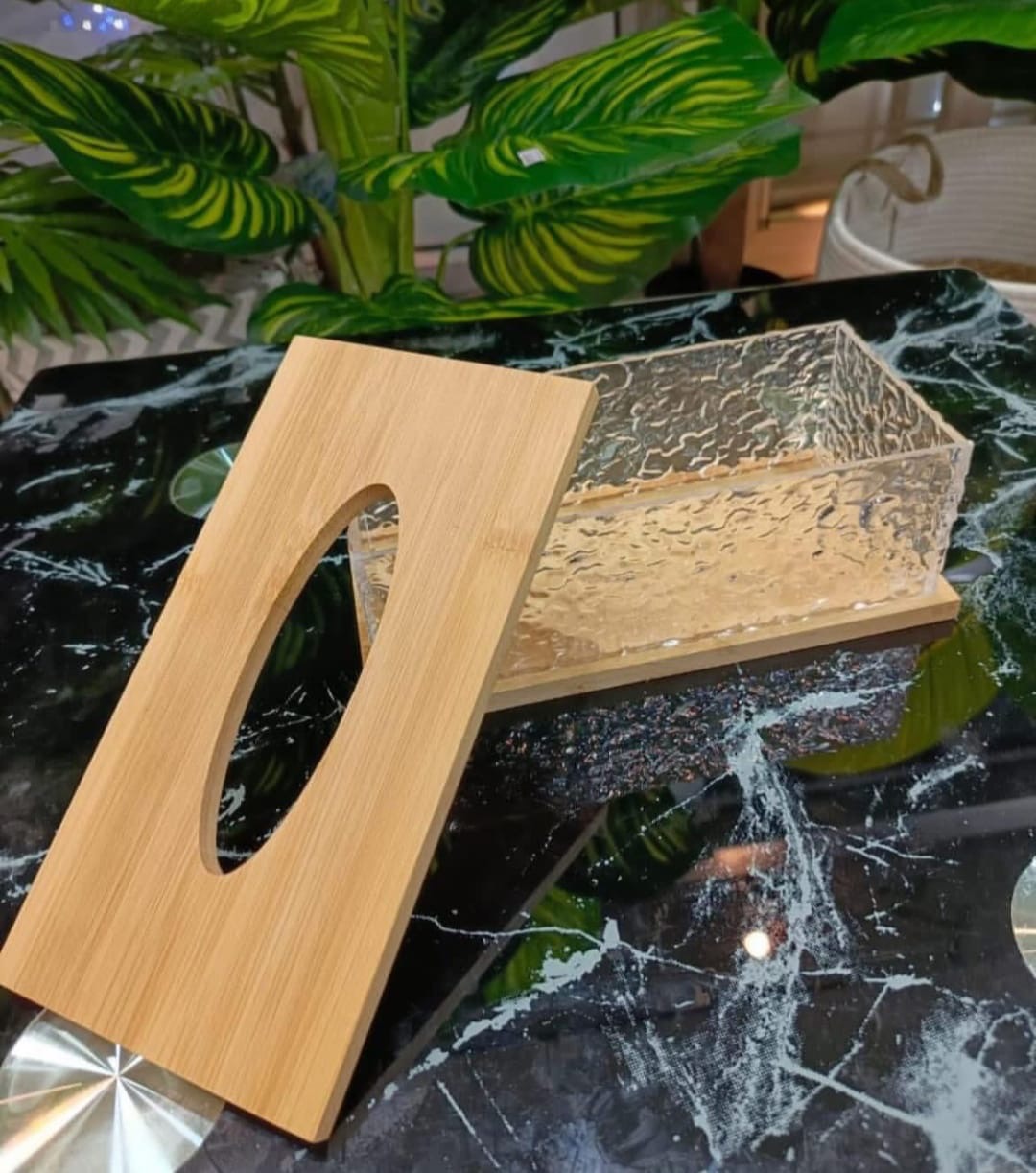 جا دستمالی آکریلیک طرح یخی بامبو، ترکیبی از زیبایی مدرن و طراحی مینیمال است که جلوهای خاص به دکور خانه یا محل کار شما میبخشد. بدنه شفاف و براق آکریلیک با درب چوبی بامبو، این محصول را به گزینهای شیک و کاربردی برای هر سبک دکوراسیونی تبدیل کرده است.