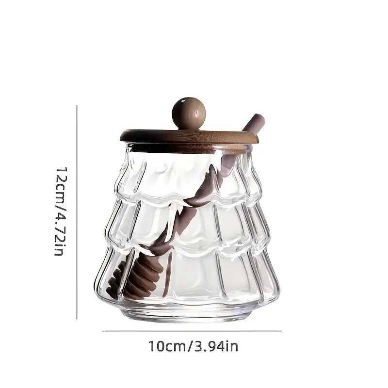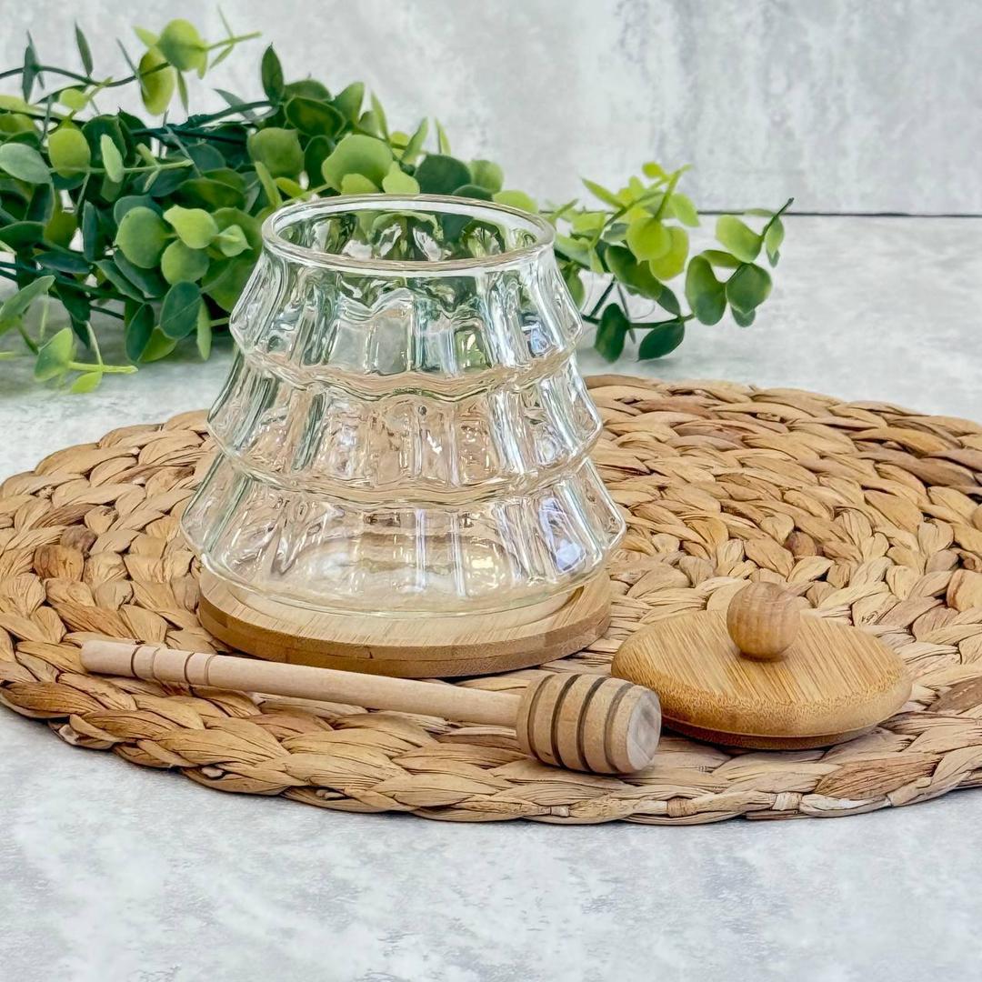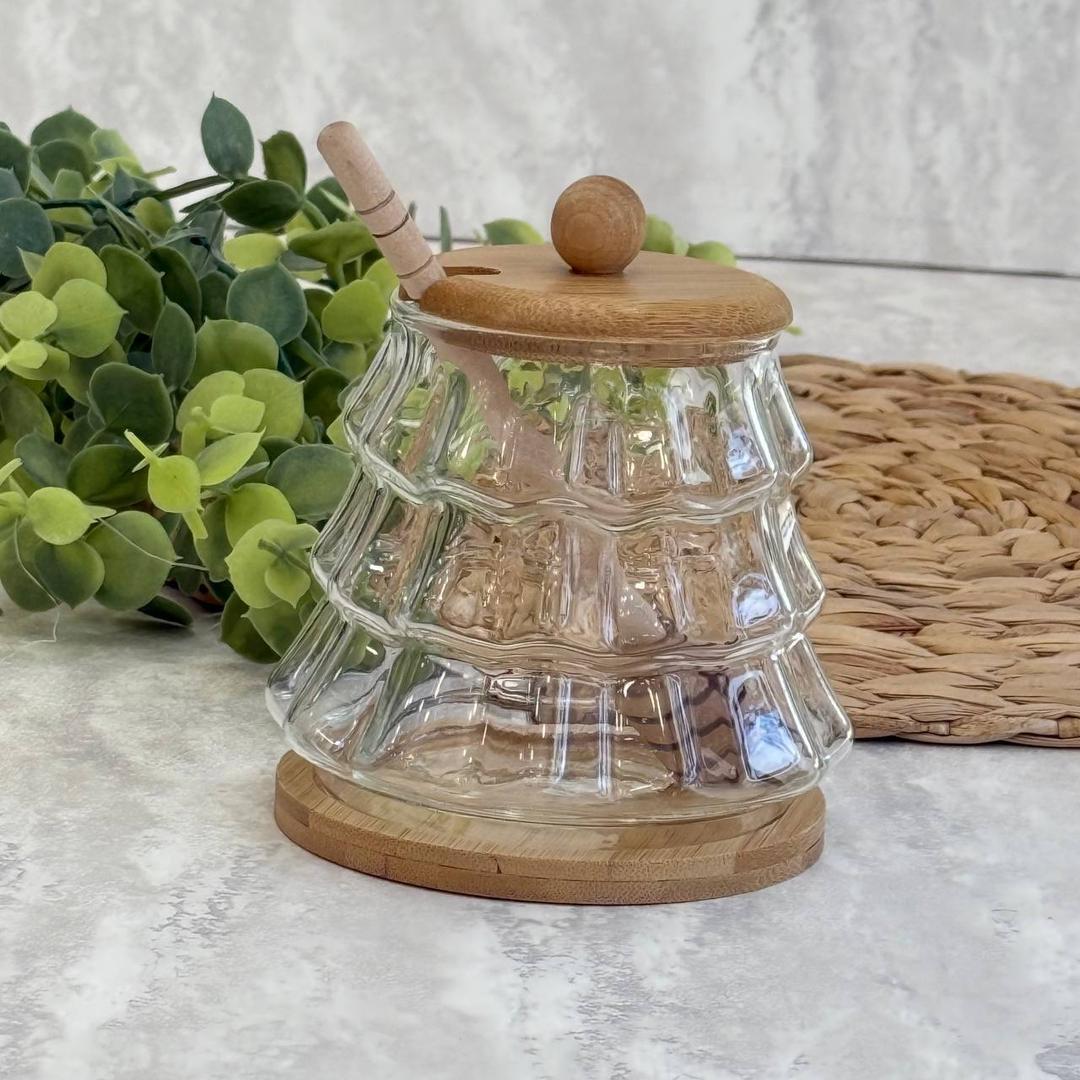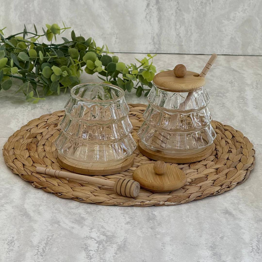 بدنهی شفاف عسلخوری باعث میشود رنگ طلایی عسل به زیبایی دیده شود و زیرهی بامبویی طرح کاج نیز بافتی طبیعی و چشمنواز به فضا میدهد. علاوه بر طراحی زیبا، این ست مجهز به قاشق مخصوص و دهانهای خوشتراش است تا هنگام استفاده، عسل بدون چسبندگی و ریختوپاش سرو شود.