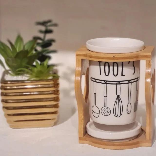 � جا قاشقی سرامیکی همراه با استند چوبی بامبو – زیبایی و نظم در آشپزخانه شما
