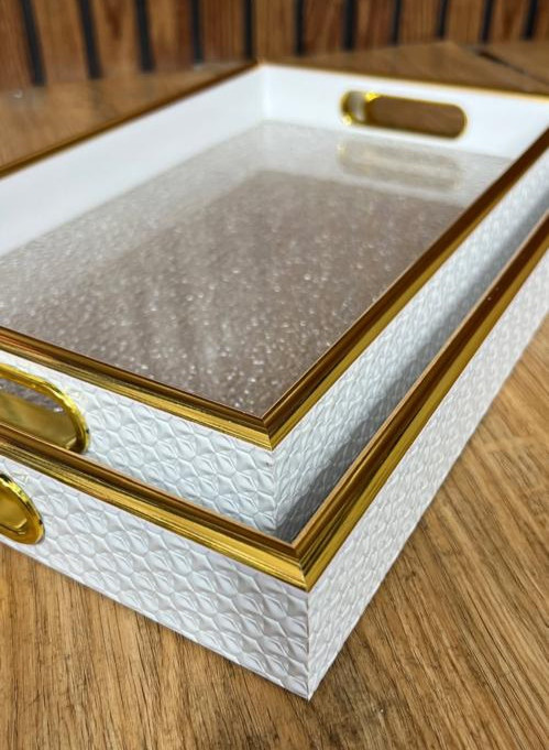 سینی دو تکه کف اکرولیک طرح یخی با دیواره چرم سفید و لب طلایی مدل لوکس