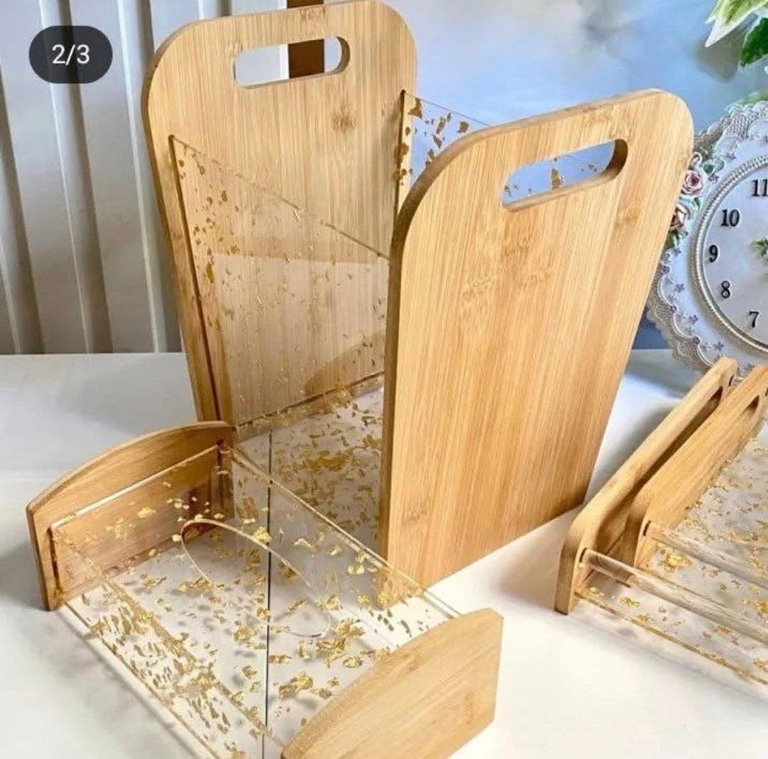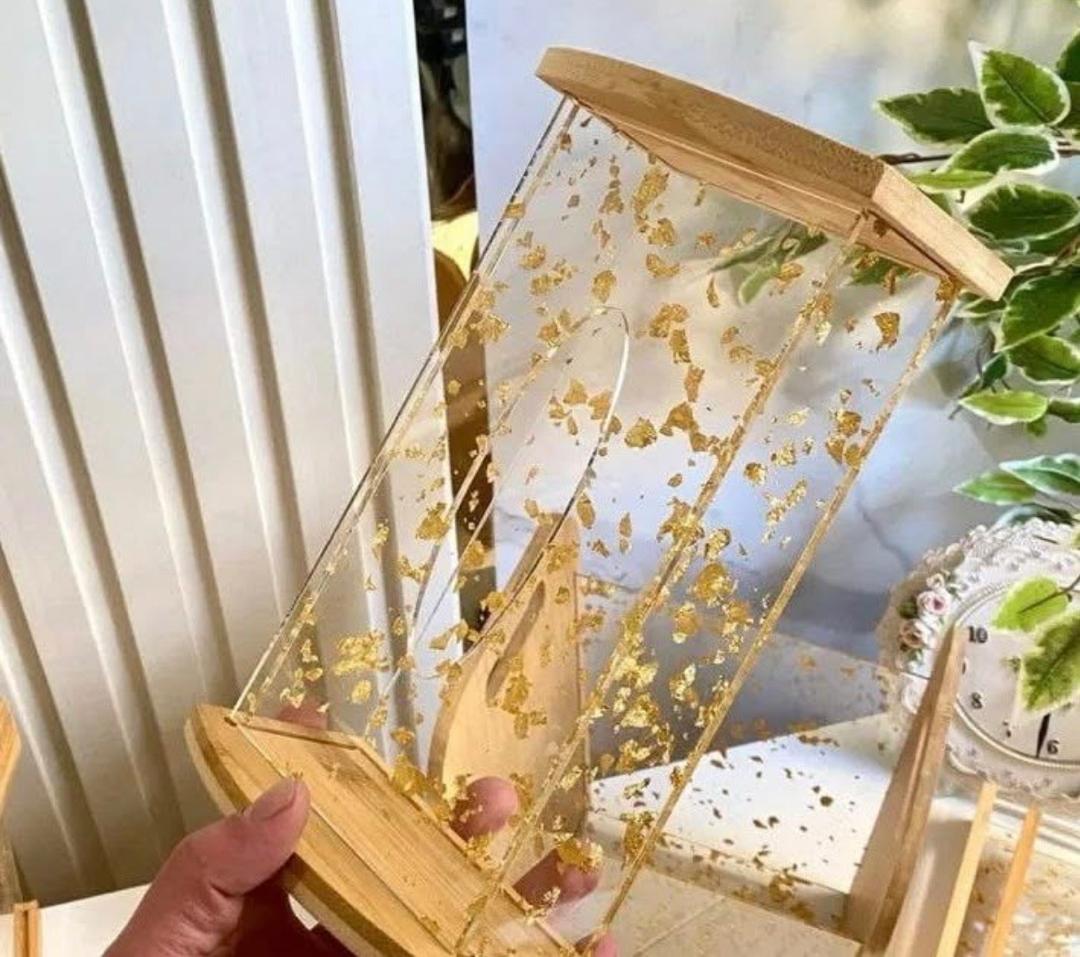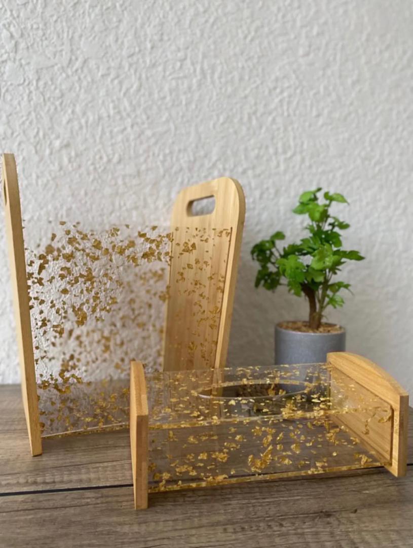 این محصول از ترکیب چوب طبیعی بامبو با رزین شفاف و تکههای طلایی ساخته شده که جلوهای بسیار زیبا، خاص و مدرن ایجاد کرده است.