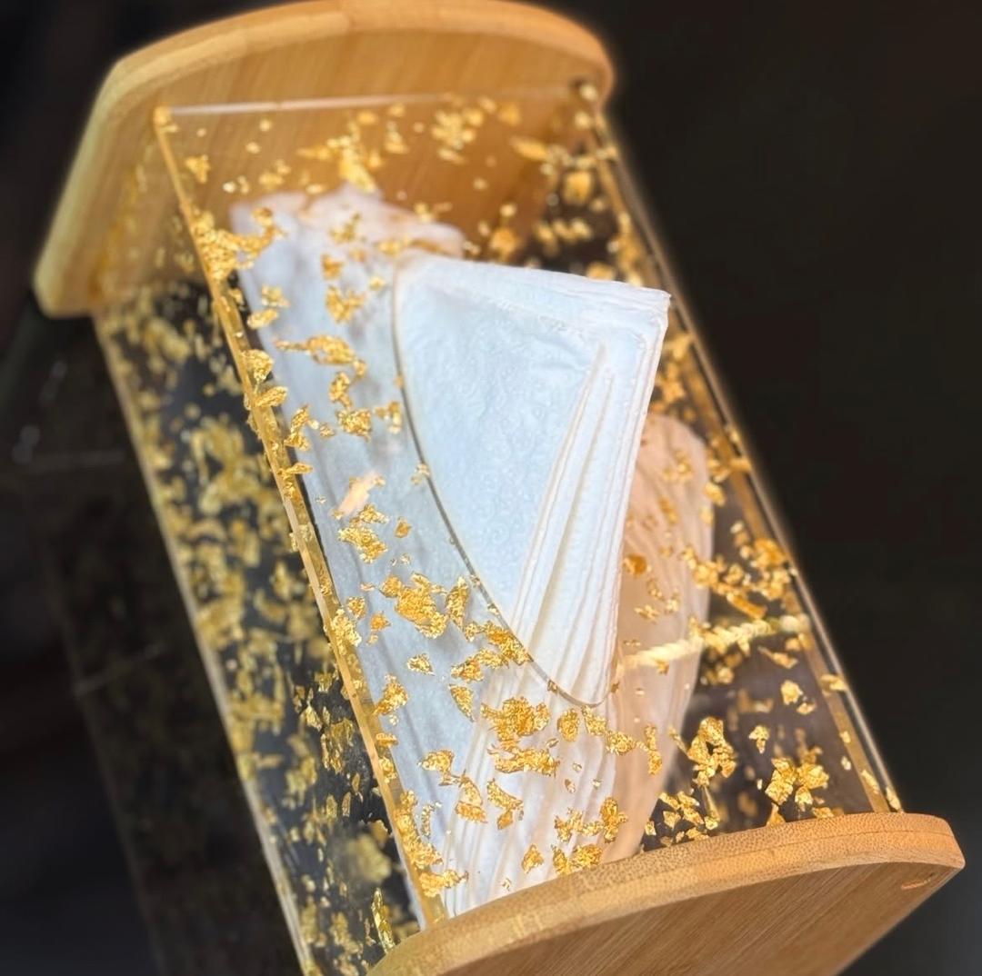 در هر ست، یک سطل کوچک شفاف رزینی با تکههای طلایی و یک جادستمال شیک با درب چوبی بامبو قرار دارد.