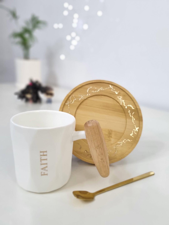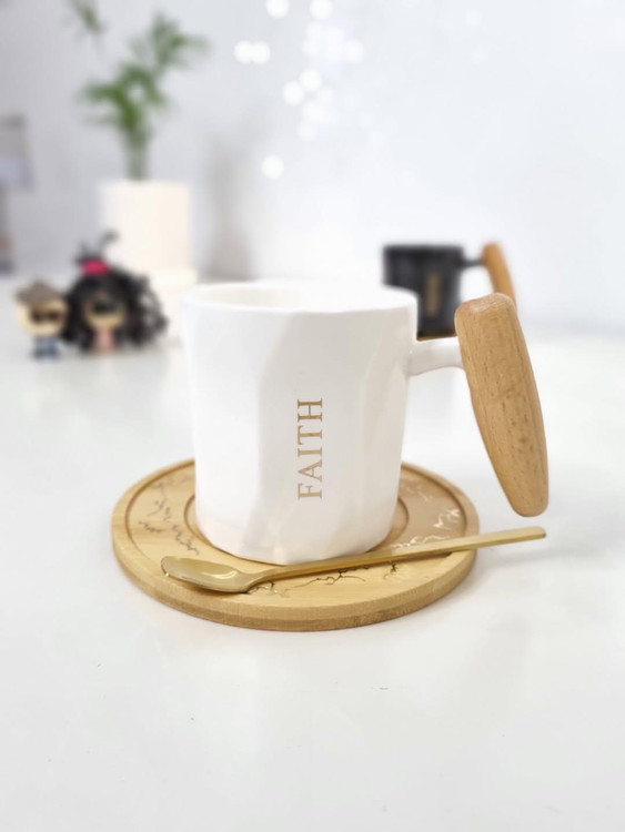 فنجان و نعلبکی سرامیکی طرح FAITH با قاشق استیل طلایی و جعبه کادویی