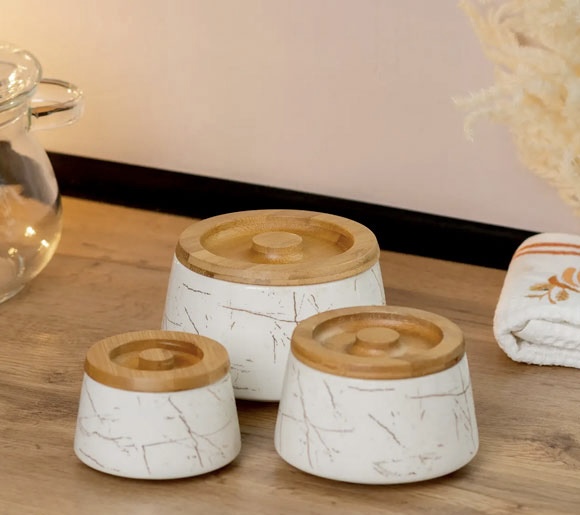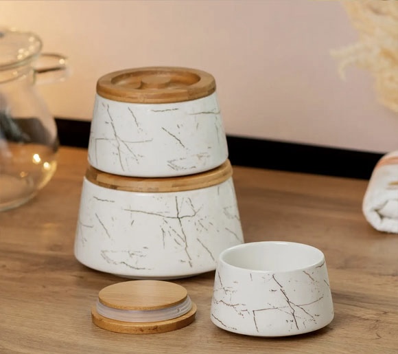 بانکه سرامیکی طرح ماربل درب بامبو – ست ۳ عددی