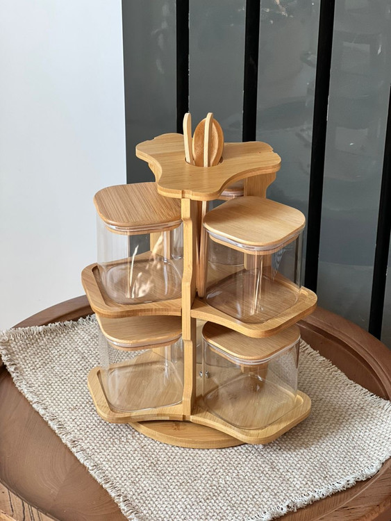 استند چرخشی ۶ عددی دوطبقه، یک انتخاب حرفهای و چشمنواز برای نظمدهی آشپزخانه و پذیرایی است. طراحی زیبا با ترکیب بامبو طبیعی و بانکههای پیرکس حرارتدیدۀ مربع این مجموعه را به یک محصول کاربردی و دکوراتیو تبدیل کرده است.
