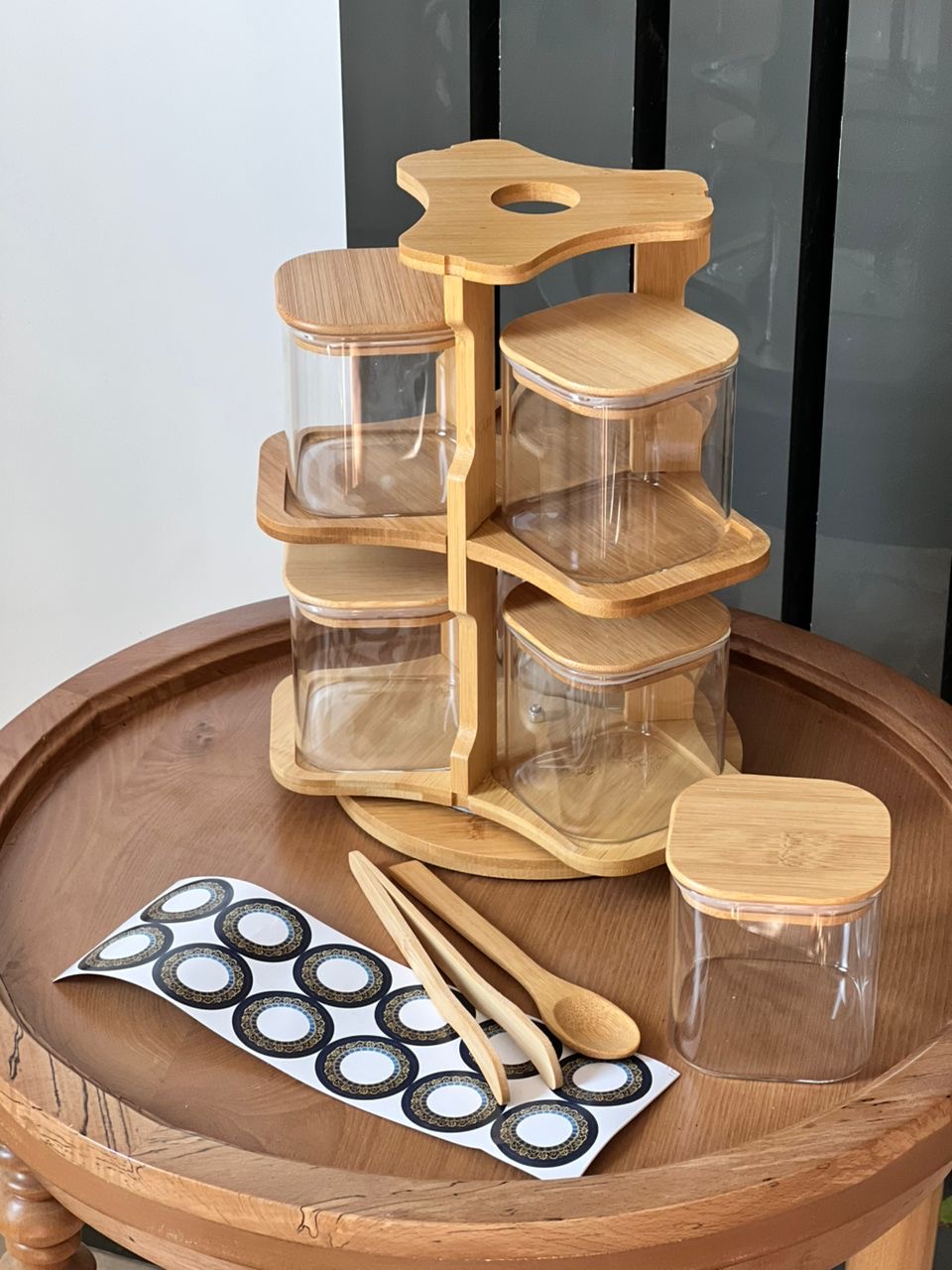 استند چرخشی ۶ عددی دوطبقه، یک انتخاب حرفهای و چشمنواز برای نظمدهی آشپزخانه و پذیرایی است. طراحی زیبا با ترکیب بامبو طبیعی و بانکههای پیرکس حرارتدیدۀ مربع این مجموعه را به یک محصول کاربردی و دکوراتیو تبدیل کرده است.