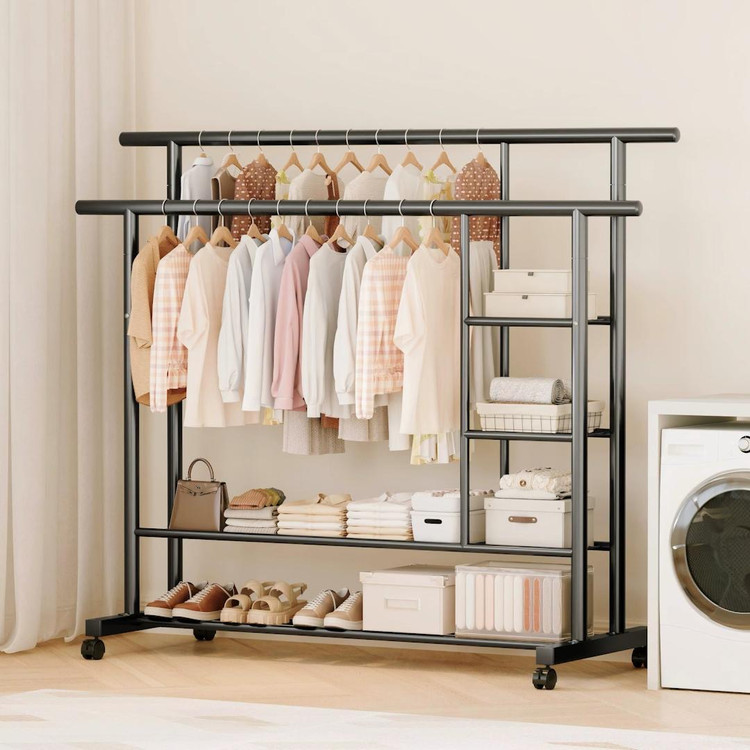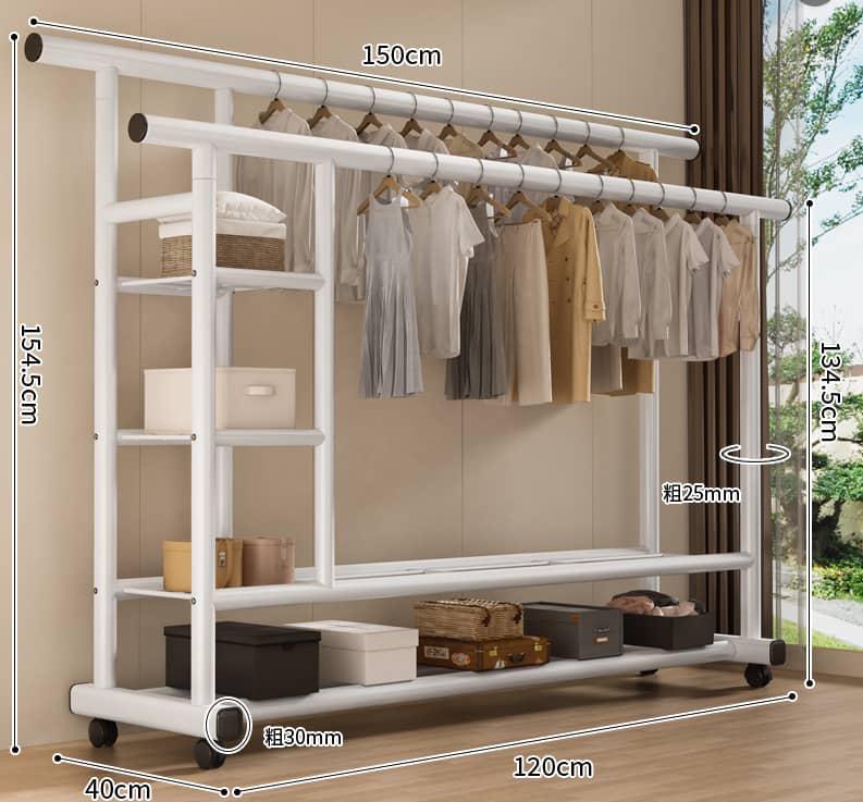 رگال لباس چرخدار دو طبقه مدل JL-8738 یک انتخاب عالی برای نظمدهی لباسها در منزل، مزون، فروشگاه و اتاق خواب است. استفاده از لوله فولادی کربن ضخیم شده فلزی با مقاومت بالا، فرآیند رنگ پخت با دمای بالا، توانایی ضد زنگ قوی، کار خوب، اتصالات لحیم کاری کامل، پرداخت صاف، جزئیات زیبا، فضای استفاده زیاد، زیبا و بادوام