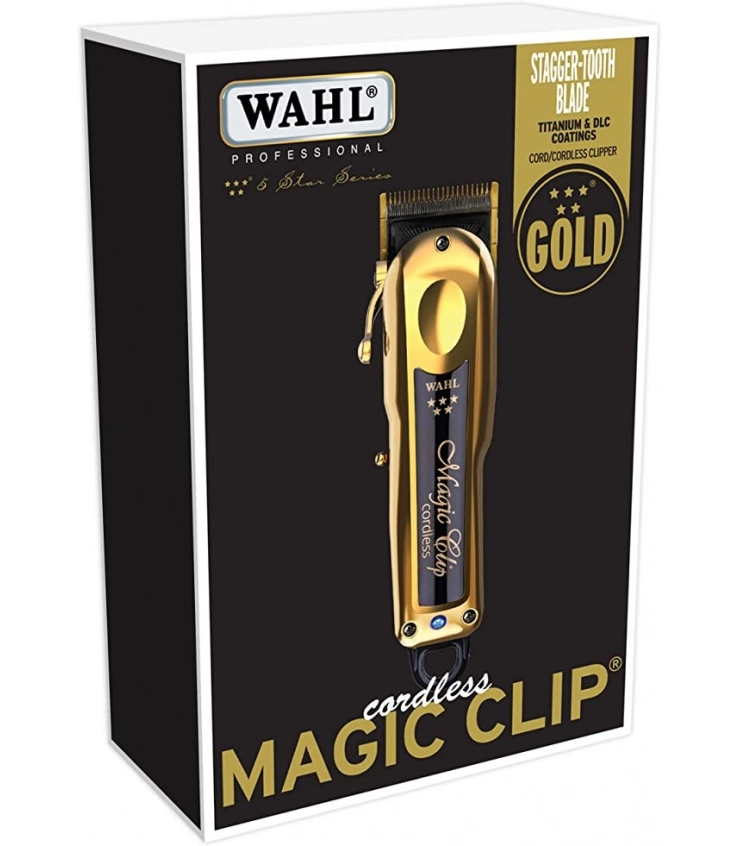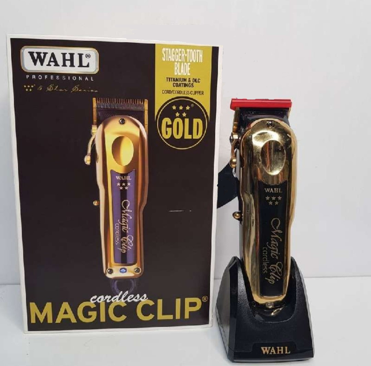 ماشین اصلاح سر و صورت وال مجیک کلیپ طلایی 5 ستاره حرفه ای Wahl Professional 5 Star Gold Cordless Magic Clip Hair Clipper 8148-700 یکی از پر قدرت ترین ماشین های اصلاح حرفه ای با باطری قوی که تا 100 دقیقه اجرا را برایتان به ارمغان می آورد و تیغههای بسیار قوی، مقاوم در برابر خوردگی دارد که دمای تیغهها را پایین میآورد و این خصوصیت را به عنوان جادو تیغه مطرح کرده اند و قابل استفاده با سیم /بیسیم است.