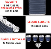این فلاسک دارای طراحی لبه گرد یکنواخت است که به راحتی در دست شما قرار می گیرد در حالی که فولاد ضد زنگ تجربه صاف، بدون درز و طولانی مدت را تضمین می کند. نگهدارنده نوشیدنی فلاسک برای تجربه نوشیدنی آسان با یک دست طراحی شده است. ظرفیت: 9 اونس (265 میلی لیتر). فلاسک هیپ برای مردان و زنان هر دو.