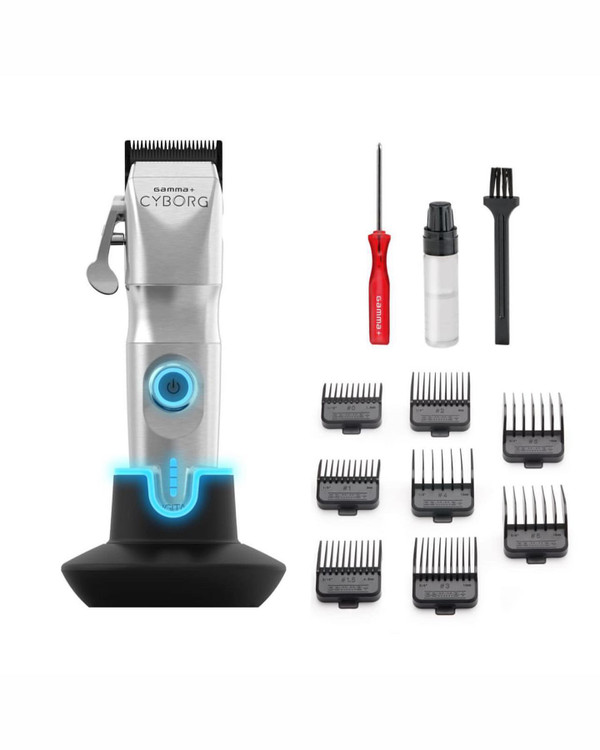 8 عدد شانه مگنتی (1.5 – 3 – 4.5 – 6 – 10 – 13 – 16 – 19)آداپتور, ابزار تنظیم تیغه, استند شارژر, اهرم سمت راست