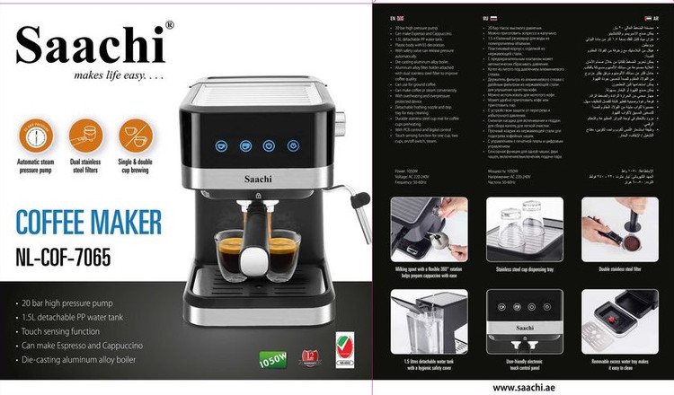 قهوهساز جدید ساچی NL-COF-7065 با پمپ حرفهای 20 بار و فشار قدرتمند 1050 وات بهخوبی CREMA غنی طلایی را برای قهوه شما استخراج میکند. ایده آل برای عاشقان قهوه که مانند یک باریستا حرفه ای، اسپرسو، لاته و کاپوچینوی دلپذیر را در خانه/دفتر دم کنند. میله بخار قدرتمند می تواند کف شیر ظریفی را برای کاپوچینوی مورد علاقه شما ایجاد کند و طعم آن را همان طور که دوست دارید افزایش دهد. این دستگاه همچنین می تواند فنجان های تک و دوتایی را با بهترین غلظت و طعم دم کند